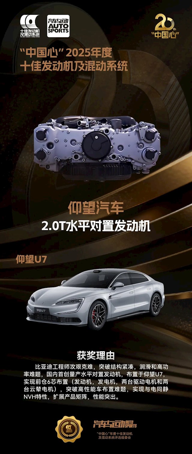 快科技11月4日消息,在“中国心”2025年度十佳发动机及混动系统评选中,比亚迪旗下仰望汽车的2.0T水平对置发动机斩获殊荣。